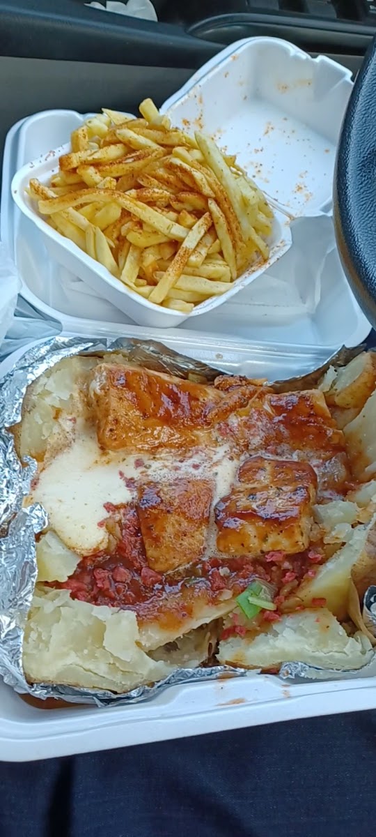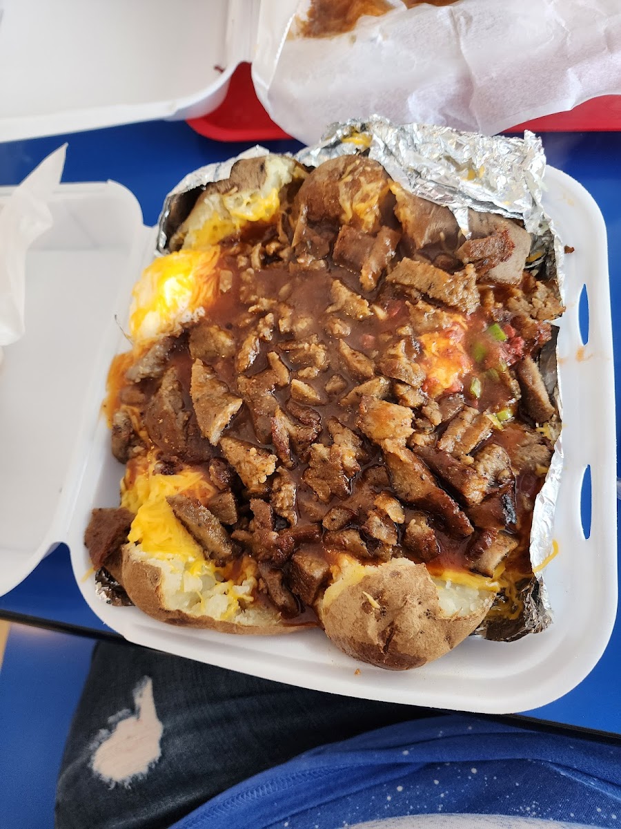 Finally got the time too stop by here and my Husband said, now these potatoes are huge. Oh My!!! I ate off my BBQ Potatoes 4 times and it was so delicious and hot. It was so big and loaded just unbelievable. This definitely will be my go too place for a potatoe. The inside is small but it's space outside, if you like outdoors.